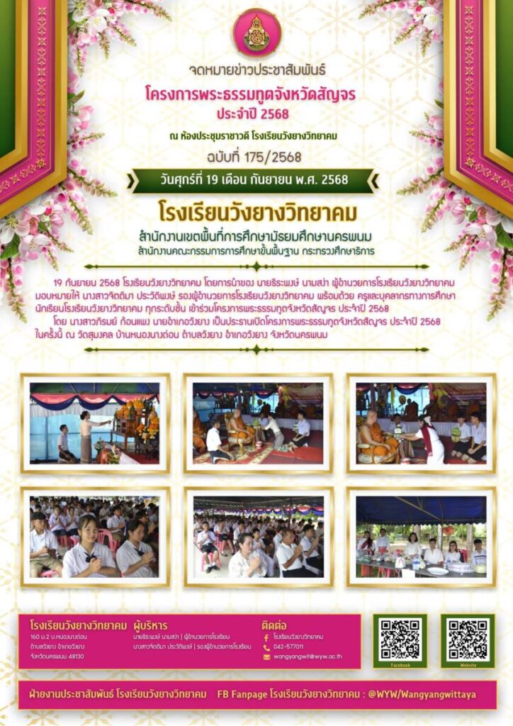 19 กันยายน 2568 โรงเรียนวังยางวิทยาคม โดยการนำของ นายธีระพงษ์ นามสง่า ผู้อำนวยการโรงเรียนวังยางวิทยาคม มอบหมายให้ นางสาวจิตติมา ประวัติพงษ์ รองผู้อำนวยการโรงเรียนวังยางวิทยาคม พร้อมด้วย ครูและบุคลากรทางการศึกษา นักเรียนโรงเรียนวังยางวิทยาคม ทุกระดับชั้น เข้าร่วมโครงการพระธรรมทูตจังหวัดสัญจร ประจำปี 2568 โดย นางสาวภิรมย์ ก้อนแพง นายอำเภอวังยาง เป็นประธานเปิดโครงการพระธรรมทูตจังหวัดสัญจร ประจำปี 2568 ในครั้งนี้ ณ วัดสุมงคล บ้านหนองนางด่อน ตำบลวังยาง อำเภอวังยาง จังหวัดนครพนม