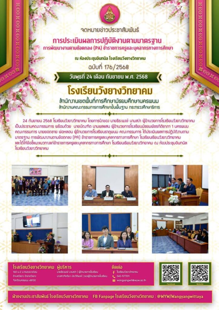 24 กันยายน 2568 โรงเรียนวังยางวิทยาคม โดยการนำของ นายธีระพงษ์ นามสง่า ผู้อำนวยการโรงเรียนวังยางวิทยาคม เป็นประธานคณะกรรมการ พร้อมด้วย นายบัณฑิต นามพลแสน ผู้อำนวยการโรงเรียนมัธยมพัชรกิติยาภา 1 นครพนม คณะกรรมการ นายยอดชาย พ่อหลอน ผู้อำนวยการโรงเรียนธาตุพนม คณะกรรมการ ได้ประเมินผลการปฏิบัติงานตามมาตรฐาน การพัฒนางานตามข้อตกลง (PA) ข้าราชการครูและบุคลากรทางการศึกษา โรงเรียนเรียนวังยางวิทยาคม และได้ให้ข้อชี้แนะแนวทางแก่ข้าราชการครูและบุคลากรทางการศึกษา โรงเรียนเรียนวังยางวิทยาคม ณ ห้องประชุมอินทนิล โรงเรียนวังยางวิทยาคม