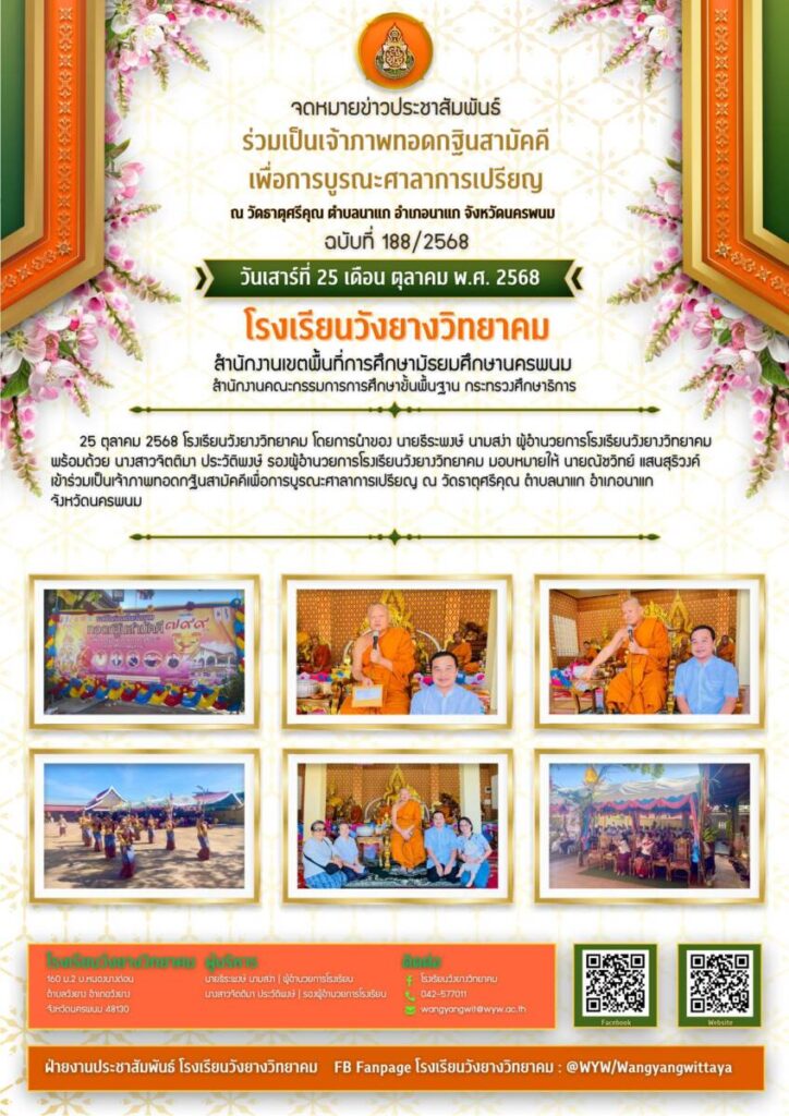 25 ตุลาคม 2568 โรงเรียนวังยางวิทยาคม โดยการนำของ นายธีระพงษ์ นามสง่า ผู้อำนวยการโรงเรียนวังยางวิทยาคม พร้อมด้วย นางสาวจิตติมา ประวัติพงษ์ รองผู้อำนวยการโรงเรียนวังยางวิทยาคม มอบหมายให้ นายณัชวิทย์ แสนสุริวงค์ เข้าร่วมเป็นเจ้าภาพทอดกฐินสามัคคีเพื่อการบูรณะศาลาการเปรียญ ณ วัดธาตุศรีคุณ ตำบลนาแก อำเภอนาแก จังหวัดนครพนม
