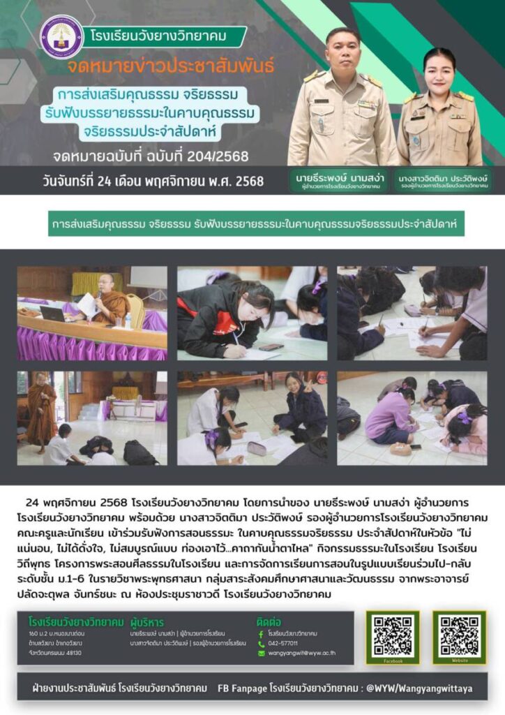 24 พฤศจิกายน 2568 โรงเรียนวังยางวิทยาคม โดยการนำของ นายธีระพงษ์ นามสง่า ผู้อำนวยการโรงเรียนวังยางวิทยาคม พร้อมด้วย นางสาวจิตติมา ประวัติพงษ์ รองผู้อำนวยการโรงเรียนวังยางวิทยาคม คณะครูและนักเรียน เข้าร่วมรับฟังการสอนธรรมะ ในคาบคุณธรรมจริยธรรม ประจำสัปดาห์ในหัวข้อ “ไม่แน่นอน, ไม่ได้ดั่งใจ, ไม่สมบูรณ์แบบ ท่องเอาไว้…คาถากันน้ำตาไหล” กิจกรรมธรรมะในโรงเรียน โรงเรียนวิถีพุทธ โครงการพระสอนศีลธรรมในโรงเรียน และการจัดการเรียนการสอนในรูปแบบเรียนร่วมไป-กลับ ระดับชั้น ม.1-6 ในรายวิชาพระพุทธศาสนา กลุ่มสาระสังคมศึกษาศาสนาและวัฒนธรรม จากพระอาจารย์ปลัดจะตุพล จันทร์ชนะ ณ ห้องประชุมราชาวดี โรงเรียนวังยางวิทยาคม
