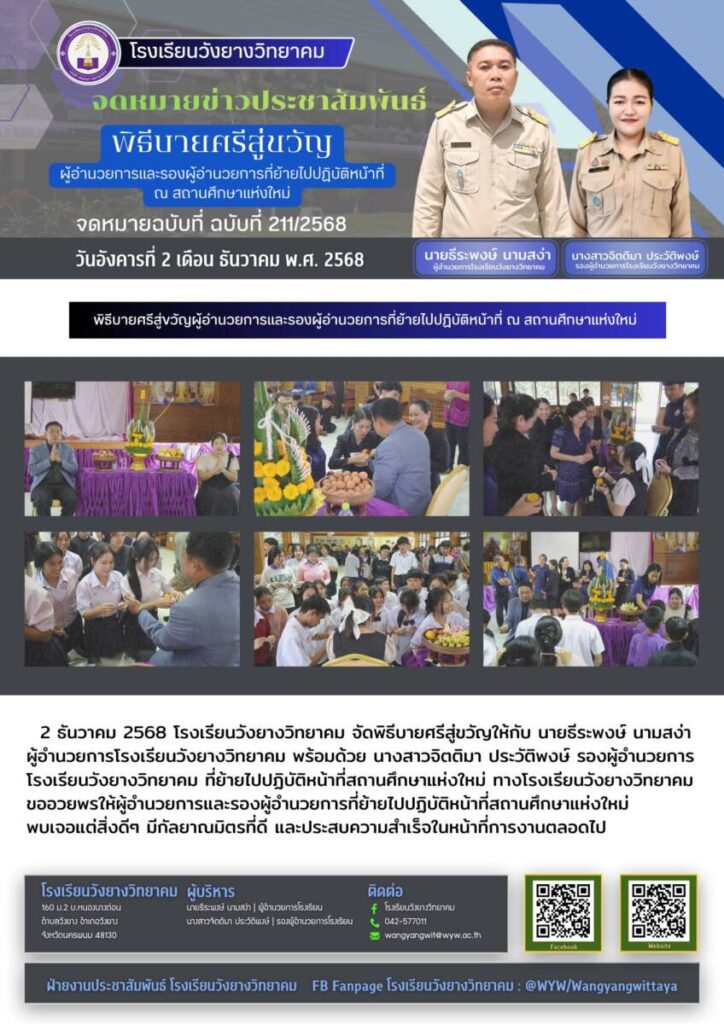 2 ธันวาคม 2568 โรงเรียนวังยางวิทยาคม โดยการนำของ นายธีระพงษ์ นามสง่า ผู้อำนวยการโรงเรียนวังยางวิทยาคม พร้อมด้วย นางสาวจิตติมา ประวัติพงษ์ รองผู้อำนวยการโรงเรียนวังยางวิทยาคม คณะครูและนักเรียน ได้จัดทำ MOU และแลกเปลี่ยนเรียนรู้โครงการสถานศึกษาสีขาวปลอดยาเสพติดและอบายมุข ณ โรงเรียนวังยางวิทยาคม