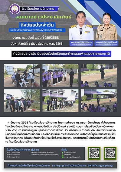 4 ธันวาคม 2568 โรงเรียนวังยางวิทยาคม โดยการนำของ ดร.พรมา จันทรโคตร ผู้อำนวยการโรงเรียนวังยางวิทยาคม นางสาวจิตติมา ประวัติพงษ์ รองผู้อำนวยการโรงเรียนวังยางวิทยาคม พร้อมด้วย ข้าราชการครูและบุคลากรทางการศึกษา ร่วมกิจวัตรประจําวันยืนต้อนรับนักเรียนตรวจหมวกกันน็อคด้วยความห่วงใย และกิจกรรมเข้าแถวเคารพธงชาติ ในโอกาสนี้ผู้อำนวยการโรงเรียนวังยางวิทยาคม ได้พบปะกับนักเรียนโรงเรียวังยางวิทยาคม บรรยากาศเป็นไปด้วยความเรียนร้อย ณ โรงเรียนวังยางวิทยาคม