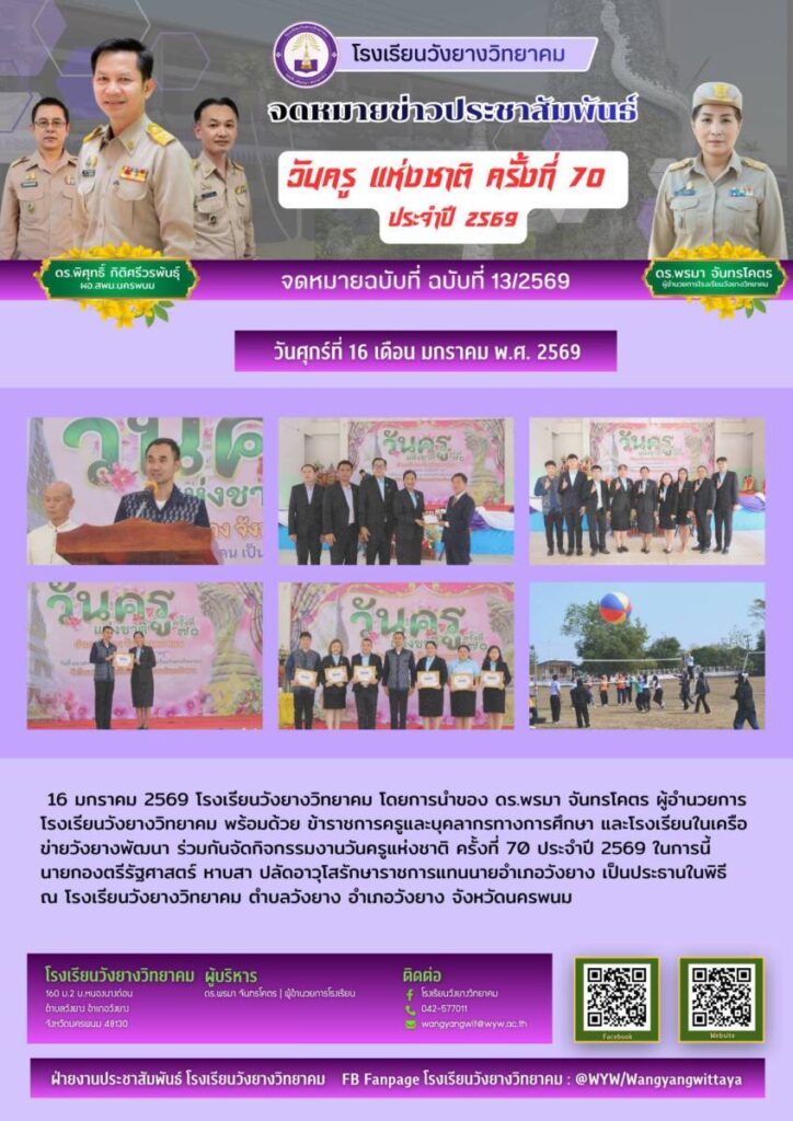 16 มกราคม 2569 โรงเรียนวังยางวิทยาคม โดยการนำของ ดร.พรมา จันทรโคตร ผู้อำนวยการโรงเรียนวังยางวิทยาคม พร้อมด้วย ข้าราชการครูและบุคลากรทางการศึกษา และโรงเรียนในเครือข่ายวังยางพัฒนา ร่วมกันจัดกิจกรรมงานวันครูแห่งชาติ ครั้งที่ 70 ประจำปี 2569 ในการนี้ นายกองตรีรัฐศาสตร์ หาบสา ปลัดอาวุโสรักษาราชการแทนนายอำเภอวังยาง เป็นประธานในพิธี ณ โรงเรียนวังยางวิทยาคม ตำบลวังยาง อำเภอวังยาง จังหวัดนครพนม