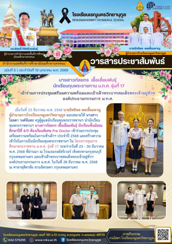ข่าวประชาสัมพันธ์โรงเรียนเรณูนครวิทยานุกูลฉบับที่ 5/2569 / จดหมายข่าวโรงเรียนในสังกัด / By โรงเรียนเรณูนครวิทยานุกูล - / 19 มกราคม 2026 จำนวนคนดู : 0