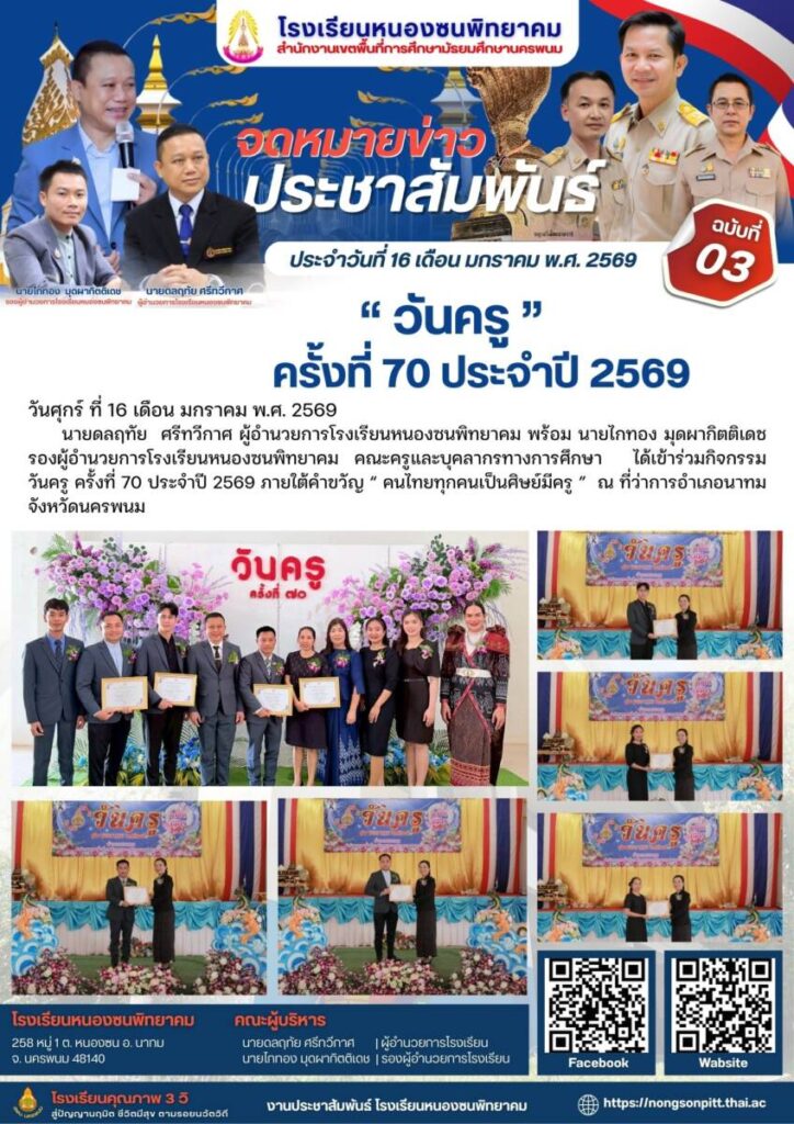 หนองซนพิทยาคม-วันครูครั้งที่ 70 ประจำปี 2569 / จดหมายข่าวโรงเรียนในสังกัด / By โรงเรียนหนองซนพิทยาคม - / 19 มกราคม 2026 จำนวนคนดู : 0