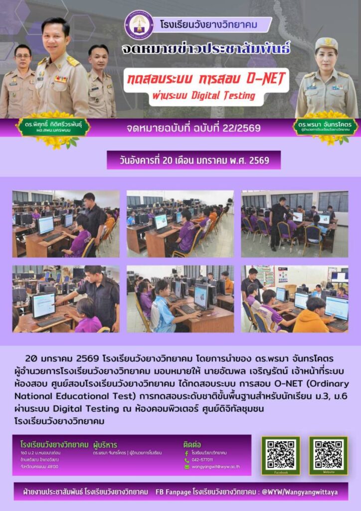 20 มกราคม 2569 โรงเรียนวังยางวิทยาคม โดยการนำของ ดร.พรมา จันทรโคตร ผู้อำนวยการโรงเรียนวังยางวิทยาคม มอบหมายให้ นายอัฒพล เจริญรัตน์ เจ้าหน้าที่ระบบห้องสอบ ศูนย์สอบโรงเรียนวังยางวิทยาคม ได้ทดสอบระบบ การสอบ O-NET (Ordinary National Educational Test) การทดสอบระดับชาติขั้นพื้นฐานสำหรับนักเรียน ม.3, ม.6 ผ่านระบบ Digital Testing ณ ห้องคอมพิวเตอร์ ศูนย์ดิจิทัลชุมชน โรงเรียนวังยางวิทยาคม