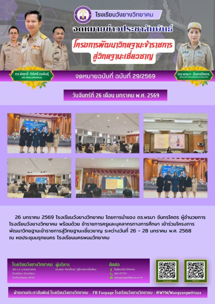 26 มกราคม 2569 โรงเรียนวังยางวิทยาคม โดยการนำของ ดร.พรมา จันทรโคตร ผู้อำนวยการโรงเรียนวังยางวิทยาคม พร้อมด้วย ข้าราชการครูและบุคลากรทางการศึกษา เข้าร่วมโครงการพัฒนาวิทยฐานะข้าราชการสู่วิทยฐานะเชี่ยวชาญ ระหว่างวันที่ 26 – 28 มกราคม พ.ศ. 2568 ณ หอประชุมมรุกขนคร โรงเรียนนครพนมวิทยาคม