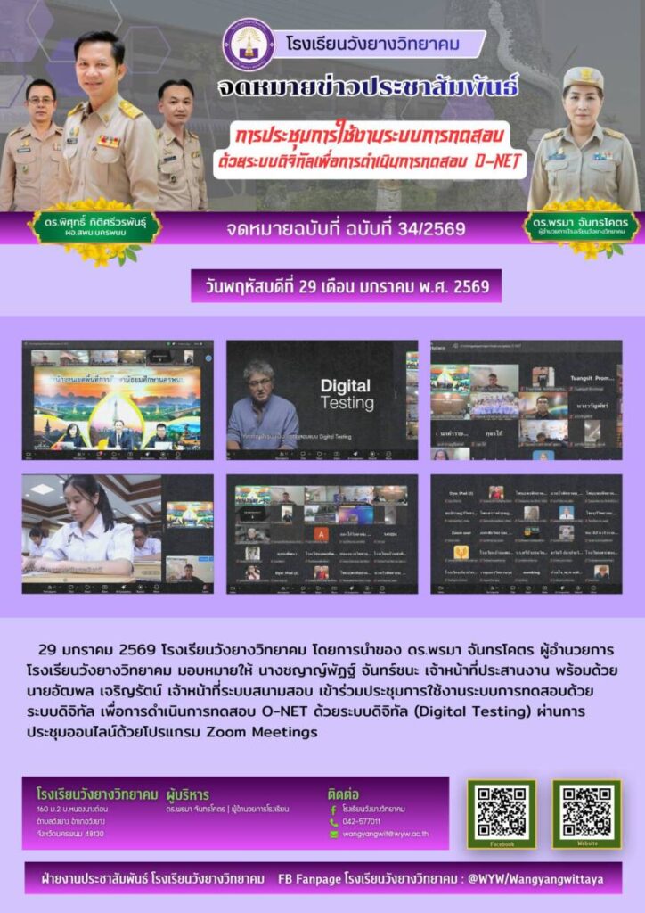 29 มกราคม 2569 โรงเรียนวังยางวิทยาคม โดยการนำของ ดร.พรมา จันทรโคตร ผู้อำนวยการโรงเรียนวังยางวิทยาคม มอบหมายให้ นางชญาญ์พัฏฐ์ จันทร์ชนะ เจ้าหน้าที่ประสานงาน พร้อมด้วย นายอัฒพล เจริญรัตน์ เจ้าหน้าที่ระบบสนามสอบ เข้าร่วมประชุมการใช้งานระบบการทดสอบด้วยระบบดิจิทัล เพื่อการดำเนินการทดสอบ O-NET ด้วยระบบดิจิทัล (Digital Testing) ผ่านการประชุมออนไลน์ด้วยโปรแกรม Zoom Meetings
