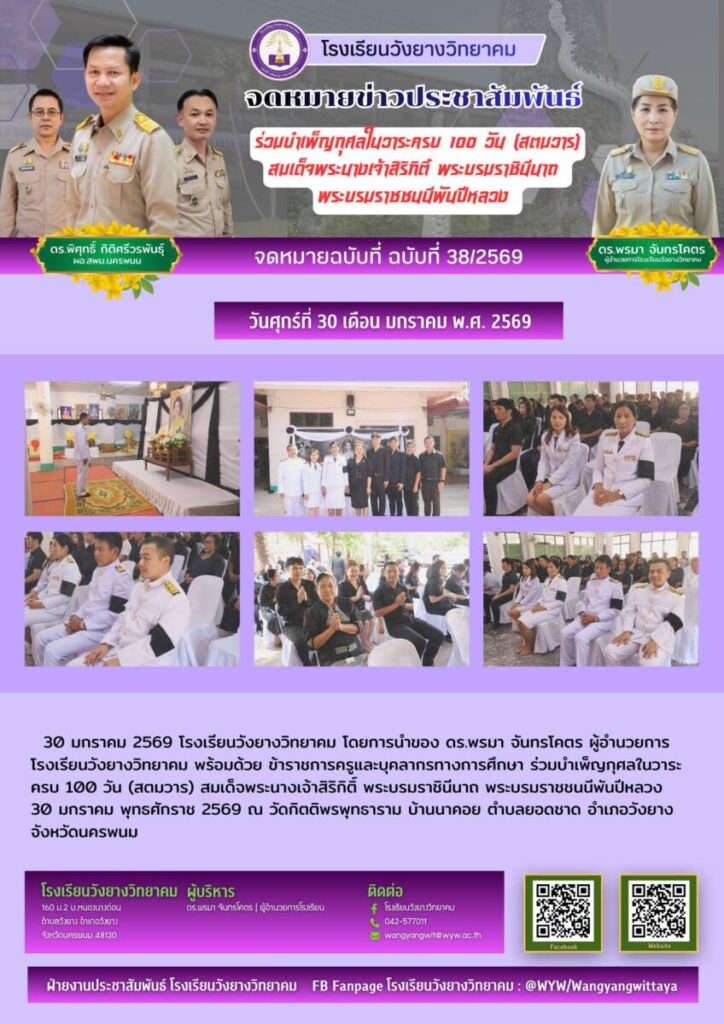 30 มกราคม 2569 โรงเรียนวังยางวิทยาคม โดยการนำของ ดร.พรมา จันทรโคตร ผู้อำนวยการโรงเรียนวังยางวิทยาคม พร้อมด้วย ข้าราชการครูและบุคลากรทางการศึกษา ร่วมบำเพ็ญกุศลในวาระครบ 100 วัน (สตมวาร) สมเด็จพระนางเจ้าสิริกิติ์ พระบรมราชินีนาถ พระบรมราชชนนีพันปีหลวง 30 มกราคม พุทธศักราช 2569 ณ วัดกิตติพรพุทธาราม บ้านนาคอย ตำบลยอดชาด อำเภอวังยาง จังหวัดนครพนม