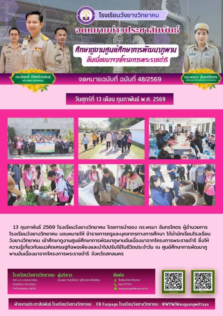 13 กุมภาพันธ์ 2569 โรงเรียนวังยางวิทยาคม โดยการนำของ ดร.พรมา จันทรโคตร ผู้อำนวยการโรงเรียนวังยางวิทยาคม มอบหมายให้ ข้าราชการครูและบุคลากรทางการศึกษา นำนักเรียนโรงเรียนวังยางวิทยาคม เข้าศึกษาดูงานศูนย์ศึกษาการพัฒนาภูพานอันเนื่องมาจากโครงการพระราชดำริ ซึ่งให้ความรู้เกี่ยวกับแนวคิดเศรษฐกิจพอเพียงและนำไปปรับใช้ในชีวิตประจำวัน ณ ศูนย์ศึกษาการพัฒนาภูพานอันเนื่องมาจากโครงการพระราชดำริ จังหวัดสกลนคร