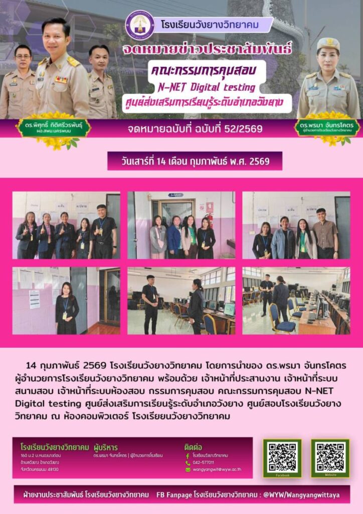 14 กุมภาพันธ์ 2569 โรงเรียนวังยางวิทยาคม โดยการนำของ ดร.พรมา จันทรโคตร ผู้อำนวยการโรงเรียนวังยางวิทยาคม พร้อมด้วย เจ้าหน้าที่ประสานงาน เจ้าหน้าที่ระบบสนามสอบ เจ้าหน้าที่ระบบห้องสอบ กรรมการคุมสอบ คณะกรรมการคุมสอบ N-NET Digital testing ศูนย์ส่งเสริมการเรียนรู้ระดับอำเภอวังยาง ศูนย์สอบโรงเรียนวังยางวิทยาคม ณ ห้องคอมพิวเตอร์ โรงเรียยนวังยางวิทยาคม