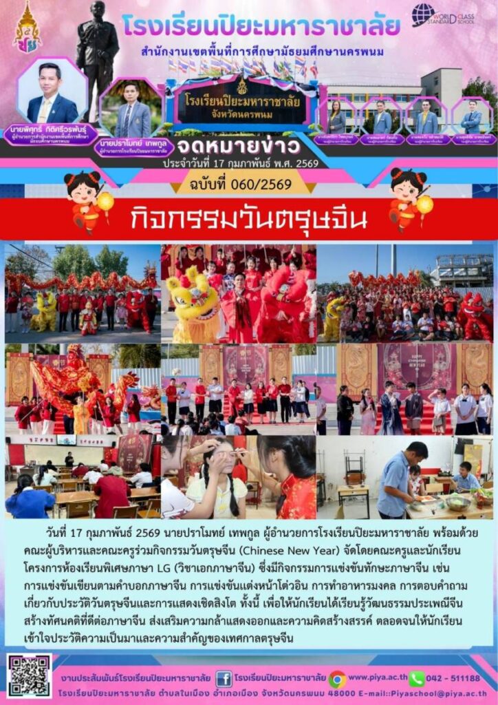 โรงเรียนปิยะมหาราชาลัย ฉบับที่ 060/69 / จดหมายข่าวโรงเรียนในสังกัด / By โรงเรียนปิยะมหาราชาลัย / 19 กุมภาพันธ์ 2026 จำนวนคนดู : 0