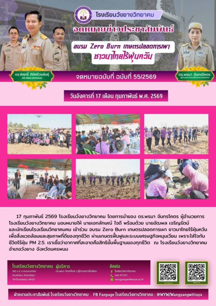 17 กุมภาพันธ์ 2569 โรงเรียนวังยางวิทยาคม โดยการนำของ ดร.พรมา จันทรโคตร ผู้อำนวยการโรงเรียนวังยางวิทยาคม มอบหมายให้ นายเอกลักษณ์ ใจดี พร้อมด้วย นายอัฒพล เจริญรัตน์ และนักเรียนโรงเรียนวิทยาคมคม เข้าร่วม อบรม Zero Burn เกษตรปลอดการเผา ชาวนาไทยไร้ฝุ่นควัน เพื่อสิ่งแวดล้อมและสุขภาพที่ดีของทุกชีวิต ผ่านเกษตรฟื้นฟูและระบบเศรษฐกิจหมุนเวียน เพราะใส่ใจกับชีวิตไร้ฝุ่น PM 2.5. เราเชื่อว่าอากาศที่สะอาดคือสิทธิขั้นพื้นฐานของทุกชีวิต ณ โรงเรียนวังยางวิทยาคม อำเภอวังยาง จังหวัดนครพนม