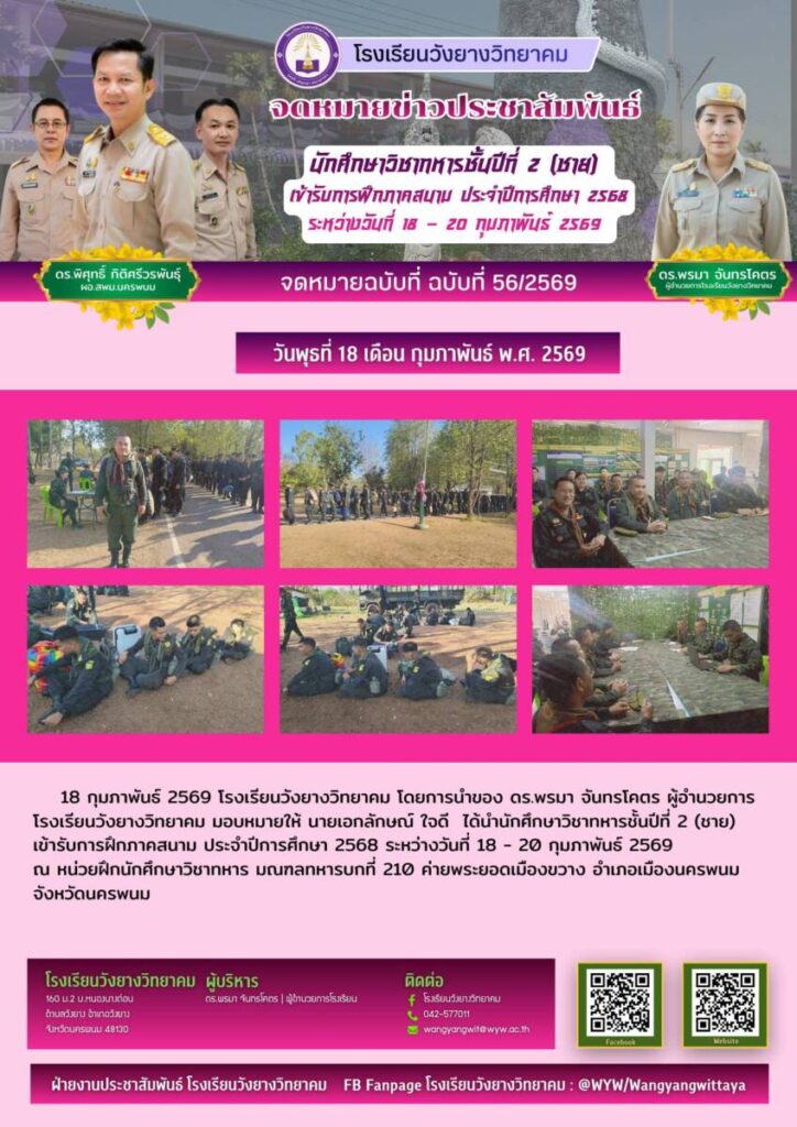 18 กุมภาพันธ์ 2569 โรงเรียนวังยางวิทยาคม โดยการนำของ ดร.พรมา จันทรโคตร ผู้อำนวยการโรงเรียนวังยางวิทยาคม มอบหมายให้ นายเอกลักษณ์ ใจดี ได้นำนักศึกษาวิชาทหารชั้นปีที่ 2 (ชาย) เข้ารับการฝึกภาคสนาม ประจำปีการศึกษา 2568 ระหว่างวันที่ 18 – 20 กุมภาพันธ์ 2569 ณ หน่วยฝึกนักศึกษาวิชาทหาร มณฑลทหารบกที่ 210 ค่ายพระยอดเมืองขวาง อำเภอเมืองนครพนม จังหวัดนครพนม