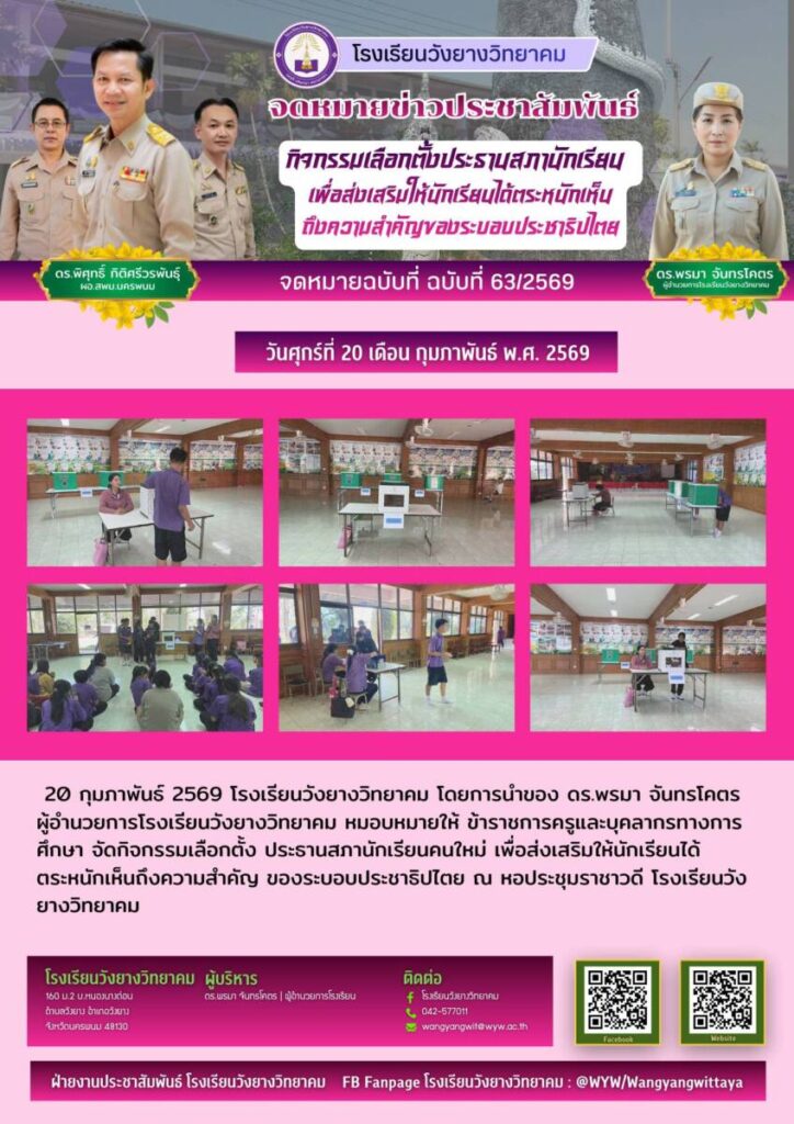 20 กุมภาพันธ์ 2569 โรงเรียนวังยางวิทยาคม โดยการนำของ ดร.พรมา จันทรโคตร ผู้อำนวยการโรงเรียนวังยางวิทยาคม หมอบหมายให้ ข้าราชการครูและบุคลากรทางการศึกษา จัดกิจกรรมเลือกตั้ง ประธานสภานักเรียนคนใหม่ เพื่อส่งเสริมให้นักเรียนได้ตระหนักเห็นถึงความสำคัญ ของระบอบประชาธิปไตย ณ หอประชุมราชาวดี โรงเรียนวังยางวิทยาคม