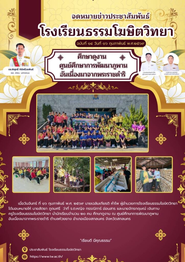 ศึกษาดูงานศูนย์ศึกษาการพัฒนาภูพานอันเนื่องมาจากพระราชดำริ / จดหมายข่าวโรงเรียนในสังกัด / By โรงเรียนธรรมโฆษิตวิทยา - / 25 กุมภาพันธ์ 2026 จำนวนคนดู : 0