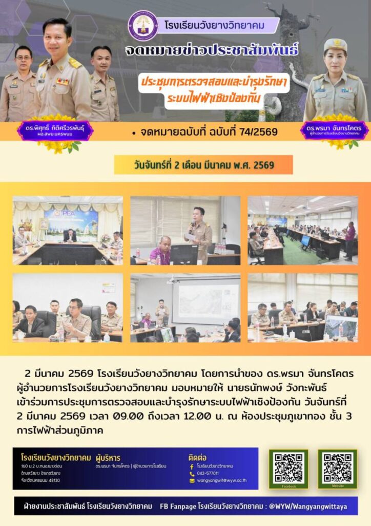 2 มีนาคม 2569 โรงเรียนวังยางวิทยาคม โดยการนำของ ดร.พรมา จันทรโคตร ผู้อำนวยการโรงเรียนวังยางวิทยาคม มอบหมายให้ นายธนัทพงษ์ วังทะพันธ์ เข้าร่วมการประชุมการตรวจสอบและบำรุงรักษาระบบไฟฟ้าเชิงป้องกัน วันจันทร์ที่ 2 มีนาคม 2569 เวลา 09.00 ถึงเวลา 12.00 น. ณ ห้องประชุมภูเขาทอง ชั้น 3 การไฟฟ้าส่วนภูมิภาค