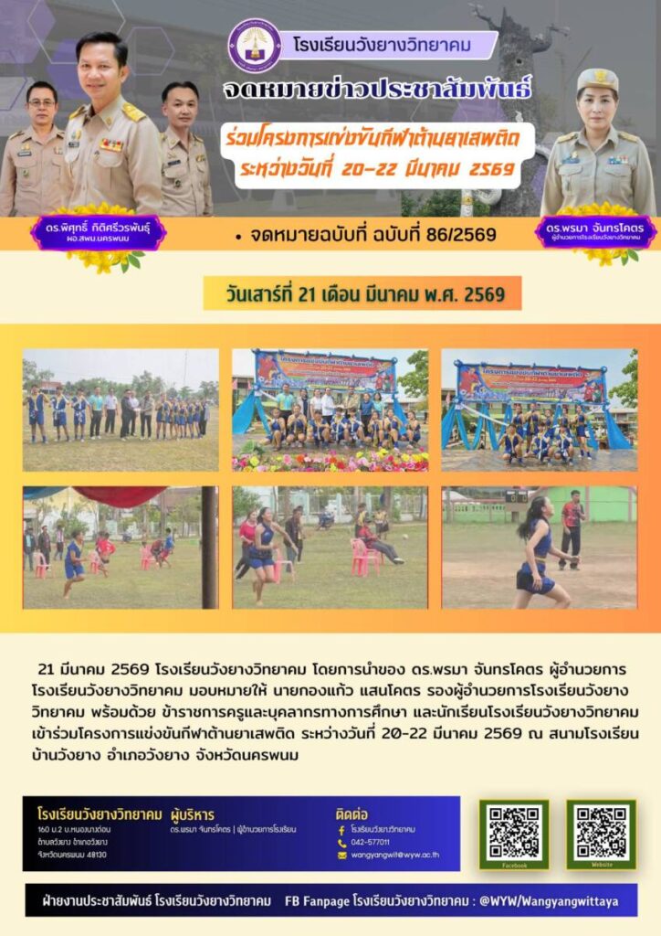 21 มีนาคม 2569 โรงเรียนวังยางวิทยาคม โดยการนำของ ดร.พรมา จันทรโคตร ผู้อำนวยการโรงเรียนวังยางวิทยาคม มอบหมายให้ นายกองแก้ว แสนโคตร รองผู้อำนวยการโรงเรียนวังยางวิทยาคม พร้อมด้วย ข้าราชการครูและบุคลากรทางการศึกษา และนักเรียนโรงเรียนวังยางวิทยาคม เข้าร่วมโครงการแข่งขันกีฬาต้านยาเสพติด ระหว่างวันที่ 20-22 มีนาคม 2569 ณ สนามโรงเรียนบ้านวังยาง อำเภอวังยาง จังหวัดนครพนม