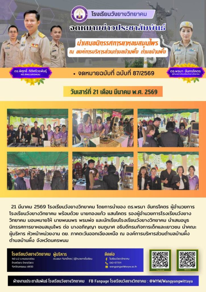 21 มีนาคม 2569 โรงเรียนวังยางวิทยาคม โดยการนำของ ดร.พรมา จันทรโคตร ผู้อำนวยการโรงเรียนวังยางวิทยาคม พร้อมด้วย นายกองแก้ว แสนโคตร รองผู้อำนวยการโรงเรียนวังยางวิทยาคม มอบหมายให้ นายพนมพร พรมพ่อ และนักเรียนโรงเรียนวังยางวิทยาคม นำเสนอบูธนิทรรศการยาหอมสมุนไพร ต่อ นางอภิญญา ชมภูมาศ อธิบดีกรมกิจการเด็กและเยาวชน นำคณะผู้บริหาร หัวหน้าหน่วยงาน ดย. ภาคตะวันออกเฉียงเหนือ ณ องค์การบริหารส่วนตำบลบ้านผึ้ง ตำบลบ้านผึ้ง จังหวัดนครพนม