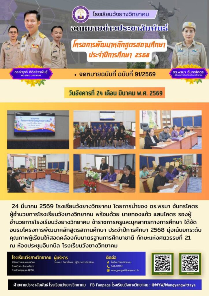 24 มีนาคม 2569 โรงเรียนวังยางวิทยาคม โดยการนำของ ดร.พรมา จันทรโคตร ผู้อำนวยการโรงเรียนวังยางวิทยาคม พร้อมด้วย นายกองแก้ว แสนโคตร รองผู้อำนวยการโรงเรียนวังยางวิทยาคม ข้าราชการครูและบุคลากรทางการศึกษา ได้จัดอบรมโครงการพัฒนาหลักสูตรสถานศึกษา ประจำปีการศึกษา 2568 มุ่งเน้นยกระดับคุณภาพผู้เรียนให้สอดคล้องกับมาตรฐานการศึกษาชาติ ทักษะแห่งศตวรรษที่ 21 ณ ห้องประชุมอินทนิล โรงเรียนวังยางวิทยาคม