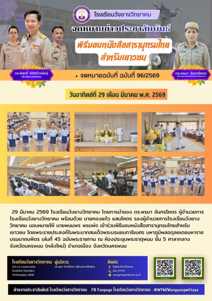 29 มีนาคม 2569 โรงเรียนวังยางวิทยาคม โดยการนำของ ดร.พรมา จันทรโคตร ผู้อำนวยการโรงเรียนวังยางวิทยาคม พร้อมด้วย นายกองแก้ว แสนโคตร รองผู้อำนวยการโรงเรียนวังยางวิทยาคม มอบหมายให้ นายพนมพร พรมพ่อ เข้าร่วมพิธีมอบหนังสือสารานุกรมไทยสำหรับเยาวชน โดยพระราชประสงค์ในพระบาทสมเด็จพระบรมชนกาธิเบศร มหาภูมิพลอดุลยเดชมหาราช บรมนาถบพิตร เล่มที่ 45 ฉบับพระราชทาน ณ ห้องประชุมพระธาตุพนม ชั้น 5 ศาลากลางจังหวัดนครพนม (หลังใหม่) อำเภอเมือง จังหวัดนครพนม