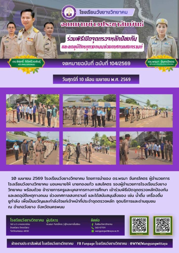 10 เมษายน 2569 โรงเรียนวังยางวิทยาคม โดยการนำของ ดร.พรมา จันทรโคตร ผู้อำนวยการโรงเรียนวังยางวิทยาคม มอบหมายให้ นายกองแก้ว แสนโคตร รองผู้อำนวยการโรงเรียนวังยางวิทยาคม พร้อมด้วย ข้าราชการครูและบุคลากรทางการศึกษา เข้าร่วมพิธีเปิดจุดตรวจหลักป้องกันและลดอุบัติเหตุทางถนน ช่วงเทศกาลสงกรานต์ และได้สนับสนุนสิ่งของ เช่น น้ำดื่ม เครื่องดื่มชูกำลัง เพื่อเป็นขวัญและกำลังใจแก่เจ้าหน้าที่ประจำจุดตรวจหลัก จุดบริการและด่านชุมชน ณ อำเภอวังยาง จังหวัดนครพนม